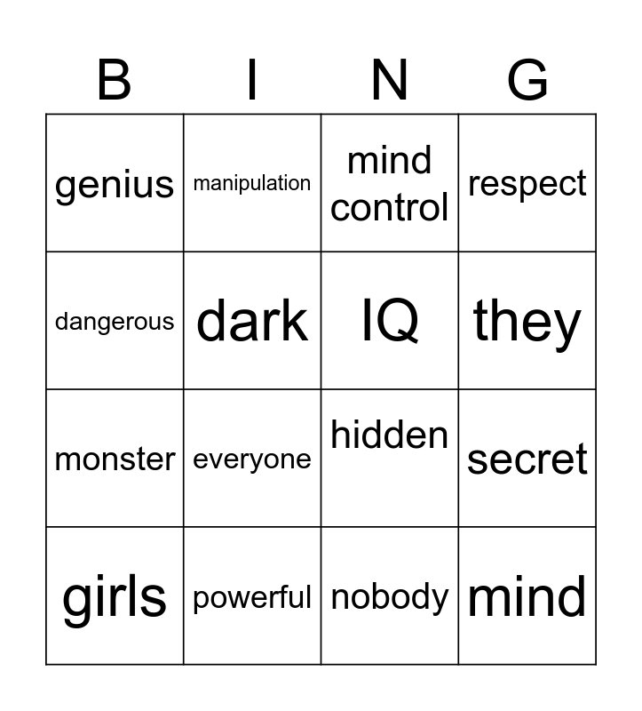 This bingo card has 16 words: powerful, secret, mind control, genius, monster, manipulation, hidden, nobody, dangerous, dark, girls, respect, everyone, they, IQ and mind.