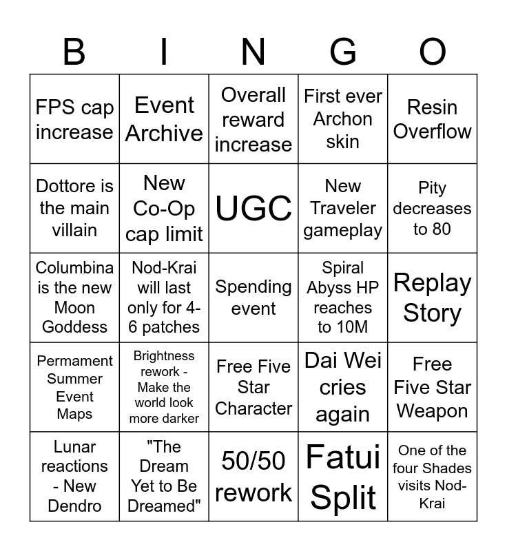 This bingo card has a free space and 24 words: Brightness rework - Make the world look more darker, "The Dream Yet to Be Dreamed", UGC, Lunar reactions - New Dendro, Resin Overflow, FPS cap increase, Dottore is the main villain, Event Archive, Spiral Abyss HP reaches to 10M, Free Five Star Character, New Traveler gameplay, Columbina is the new Moon Goddess, Dai Wei cries again, Free Five Star Weapon, New Co-Op cap limit, Fatui Split, Replay Story, Overall reward increase, Pity decreases to 80, Nod-Krai will last only for 4-6 patches, One of the four Shades visits Nod-Krai, Permament Summer Event Maps, First ever Archon skin and 50/50 rework.