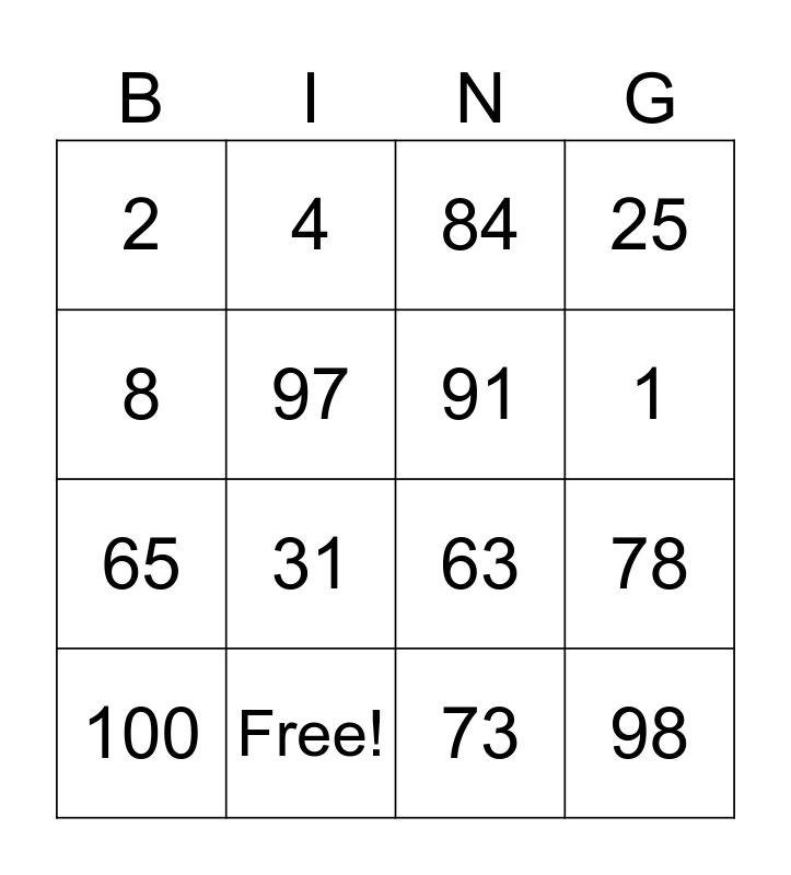 This bingo card has 24 words: 75, 85, 1, 99, 8, 2, 97, 4, Free!, 86, 65, 63, 6, 54, 91, 57, 73, 84, 31, 78, 100, 98, 25 and 47.