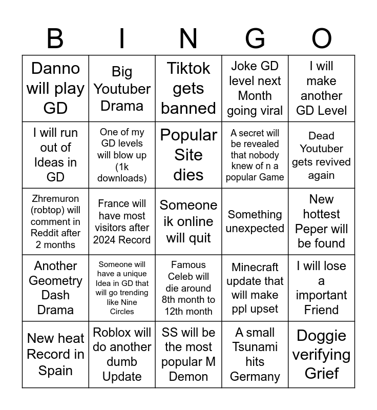 This bingo card has 25 words: Another Geometry Dash Drama, Roblox will do another dumb Update, Someone ik online will quit, A small Tsunami hits Germany, I will make another GD Level, Danno will play GD, Big Youtuber Drama, Tiktok gets banned, Something unexpected, I will lose a important Friend, I will run out of Ideas in GD, One of my GD levels will blow up (1k downloads), SS will be the most popular M Demon, Minecraft update that will make ppl upset, Dead Youtuber gets revived again, New heat Record in Spain, France will have most visitors after 2024 Record, Popular Site dies, A secret will be revealed that nobody knew of n a popular Game, New hottest Peper will be found, Zhremuron (robtop) will comment in Reddit after 2 months, Someone will have a unique Idea in GD that will go trending like Nine Circles, Famous Celeb will die around 8th month to 12th month, Joke GD level next Month going viral and Doggie verifying Grief.