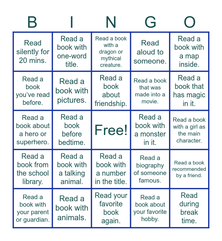 This bingo card has a free space and 24 words: Read a book with your parent or guardian., Read a book with a talking animal., Read a book about friendship., Read a book about your favorite hobby., Read a book with a map inside., Read silently for 20 mins., Read a book with one-word title., Read a book with a dragon or mythical creature., Read a book with a monster in it., Read a book with a girl as the main character., Read a book about a hero or superhero., Read a book with pictures., Read a biography of someone famous., Read a book recommended by a friend., Read a book you’ve read before., Read a book with animals., Read your favorite book again., Read aloud to someone., Read a book that has magic in it., Read a book from the school library., Read a book before bedtime., Read a book with a number in the title., Read a book that was made into a movie. and Read during break time..