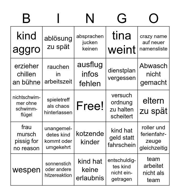 This bingo card has a free space and 24 words: unangemel-detes kind kommt oder umgekehrt, sonnenstich oder andere hitzereaktion, ausflug infos fehlen, wespen, crazy name auf neuer namensliste, kind aggro, erzieher chillen an bühne, ablösung zu spät, versuch ordnung zu halten scheitert, kotzende kinder, dienstplan vergessen, nichtschwim-mer ohne schwimm-flügel, kind hat geld statt fahrschein, roller und ferienfahr-zeuge gleichzeitig, rauchen in arbeitszeit, entschuldig-tes kind nicht ein-getragen, eltern zu spät, absprachen jucken keinen, Abwasch nicht gemacht, spieletreff als chaos hinterlassen, team arbeitet nicht als team, frau mursch pissig for no reason, tina weint and kind hat keine erlaubnis.