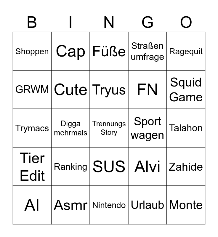 This bingo card has a free space and 24 words: Ranking, Asmr, Tryus, AI, Ragequit, Shoppen, GRWM, Cap, Sport wagen, SUS, FN, Trymacs, Alvi, Zahide, Cute, Urlaub, Talahon, Füße, Squid Game, Digga mehrmals, Monte, Tier Edit, Straßen umfrage and Nintendo.