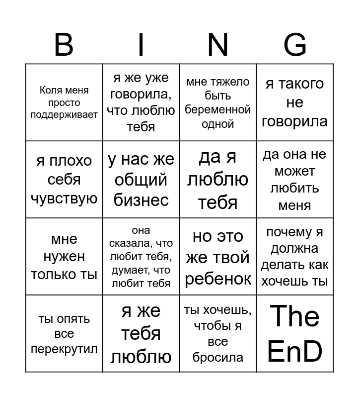 This bingo card has 16 words: я же тебя люблю, почему я должна делать как хочешь ты, мне тяжело быть беременной одной, Коля меня просто поддерживает, мне нужен только ты, я же уже говорила, что люблю тебя, но это же твой ребенок, ты хочешь, чтобы я все бросила, я плохо себя чувствую, у нас же общий бизнес, ты опять все перекрутил, я такого не говорила, она сказала, что любит тебя, думает, что любит тебя, да она не может любить меня, да я люблю тебя and The EnD.