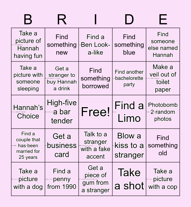 This bingo card has 21 images, a free space and 29 words: Take a picture with a dog, Buy Hannah a drink, High-five a bar tender, Make up a hand shake with a stranger, Take a picture of Hannah having fun, Find a Ben Look-a-like, Get a stranger to buy Hannah a drink, Get a business card, Find a Limo, Find a penny from 1990, Photobomb 2 random photos, Take a picture with a cop, Get a piece of gum from a stranger, Take a shot, Make a veil out of toilet paper, Find a guy named Ben, Talk to a stranger with a fake accent, Find a couple that has been married for 25 years, Find someone else named Hannah, Hannah’s Choice, Blow a kiss to a stranger, Take a picture with someone who has a bad sunburn, Find another bachelorette party, Take a picture with someone sleeping, Find something blue, Find something new, Find something old, Find something borrowed and Take a selfie with Hannah.