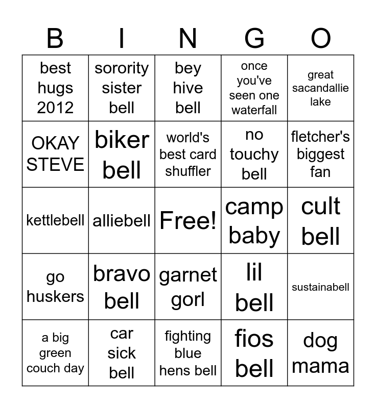 This bingo card has a free space and 29 words: a big green couch day, all things becca tilley, alliebell, alliequarius, best hugs 2012, bey hive bell, biker bell, bravo bell, camp baby, car sick bell, cult bell, dog mama, fighting blue hens bell, fios bell, fletcher's biggest fan, gaga for gaga, garnet gorl, go huskers, great sacandallie lake, kettlebell, lil bell, no showtunes, please, no touchy bell, OKAY STEVE, once you've seen one waterfall, sorority sister bell, sustainabell, world's best card shuffler and sea sick bell.
