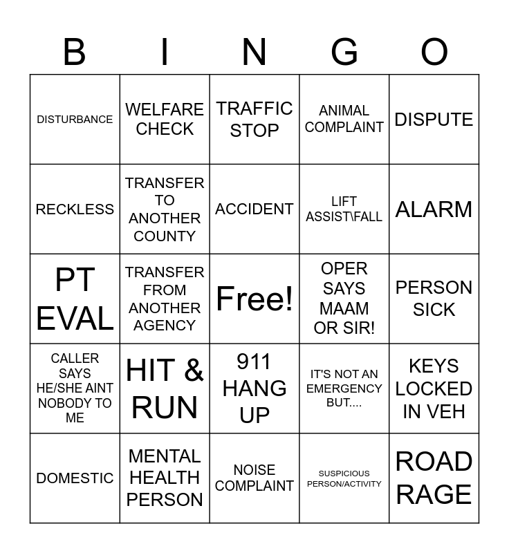 This bingo card has a free space and 24 words: HIT & RUN, MENTAL HEALTH PERSON, ACCIDENT, DOMESTIC, DISPUTE, DISTURBANCE, RECKLESS, WELFARE CHECK, OPER SAYS MAAM OR SIR!, 911 HANG UP, LIFT ASSIST\FALL, PT EVAL, IT'S NOT AN EMERGENCY BUT...., KEYS LOCKED IN VEH, TRANSFER TO ANOTHER COUNTY, SUSPICIOUS PERSON/ACTIVITY, PERSON SICK, TRAFFIC STOP, ALARM, TRANSFER FROM ANOTHER AGENCY, ROAD RAGE, CALLER SAYS HE/SHE AINT NOBODY TO ME, ANIMAL COMPLAINT and NOISE COMPLAINT.