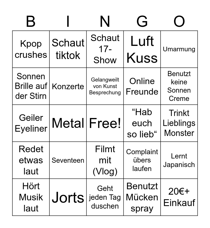 This bingo card has a free space and 24 words: Seventeen, Jorts, Gelangweilt von Kunst Besprechung, Hört Musik laut, Umarmung, Kpop crushes, Sonnen Brille auf der Stirn, Schaut tiktok, “Hab euch so lieb“, Filmt mit (Vlog), Online Freunde, Geiler Eyeliner, Complaint übers laufen, Lernt Japanisch, Konzerte, Benutzt Mücken spray, Trinkt Lieblings Monster, Schaut 17-Show, Benutzt keine Sonnen Creme, Metal, 20€+ Einkauf, Redet etwas laut, Luft Kuss and Geht jeden Tag duschen.