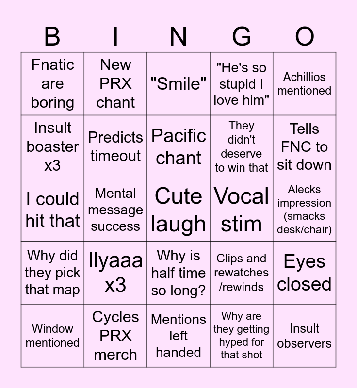 This bingo card has a free space and 24 words: Ilyaaa x3, Cycles PRX merch, Pacific chant, Window mentioned, Achillios mentioned, Fnatic are boring, Insult boaster x3, New PRX chant, Vocal stim, Why is half time so long?, They didn't deserve to win that, I could hit that, Clips and rewatches /rewinds, Eyes closed, Predicts timeout, Why are they getting hyped for that shot, Alecks impression (smacks desk/chair), "Smile", Tells FNC to sit down, Mental message success, Insult observers, Why did they pick that map, "He's so stupid I love him" and Mentions left handed.