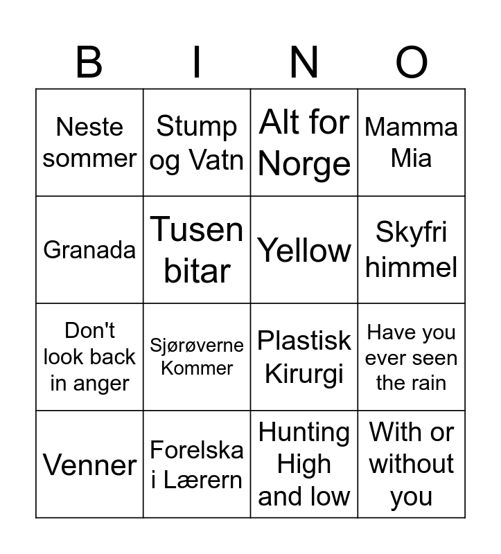 This bingo card has 45 words: Tore Tang, Venner, Lemon Tree, Hit Me Baby One More Time, Splitter Pine, Jenter, Alt for Norge, Sweet Caroline, Granada, Min Første Kjærlighet, Mamma Mia, Forelska i Lærern, Country Roads, Optimist, Kumbaya, Idyll, En solskinnsdag, Plastisk Kirurgi, Bursdagssang, Sjørøverne Kommer, Stump og Vatn, Take on Me, Wonderwall, Neste sommer, Rumba med Gunn, Hunting High and low, Stucked in a moment, Angels, Heaven, With or without you, Let it be, Tidløs, Hotel California, Onkel Pers Kjøkkenbord, Sett deg på andletet mitt, Have you ever seen the rain, When September ends, Floden, Alt du vil ha, Skyfri himmel, Tusen bitar, Don't look back in anger, Shallow, Yellow and Winds of change.