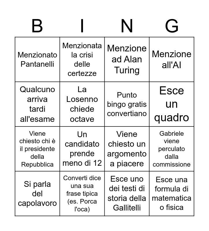 This bingo card has 21 words: Converti dice una sua frase tipica (es. Porca l'oca), Un candidato prende 20, Menzionata la crisi delle certezze, Viene rifiutato un collegamento, Esce uno dei testi di storia della Gallitelli, Punto bingo gratis convertiano, Menzionato Pantanelli, Menzione ad Alan Turing, Viene chiesto un argomento a piacere, Esce un quadro, Viene chiesto chi è il presidente della Repubblica, Menzione all'AI, Esce una formula di matematica o fisica, Si parla della guerra a Gaza, La Losenno chiede octave, Storia o filosofia chiede argomenti mai affrontati, Si parla del capolavoro, Un candidato prende meno di 12, Qualcuno arriva tardi all'esame, Gabriele viene perculato dalla commissione and esercizio di fisica o matematica.