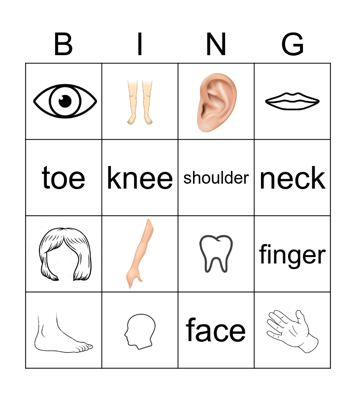 This bingo card has 11 images and 7 words: neck, face, toe, finger, knee, shoulder and chest.