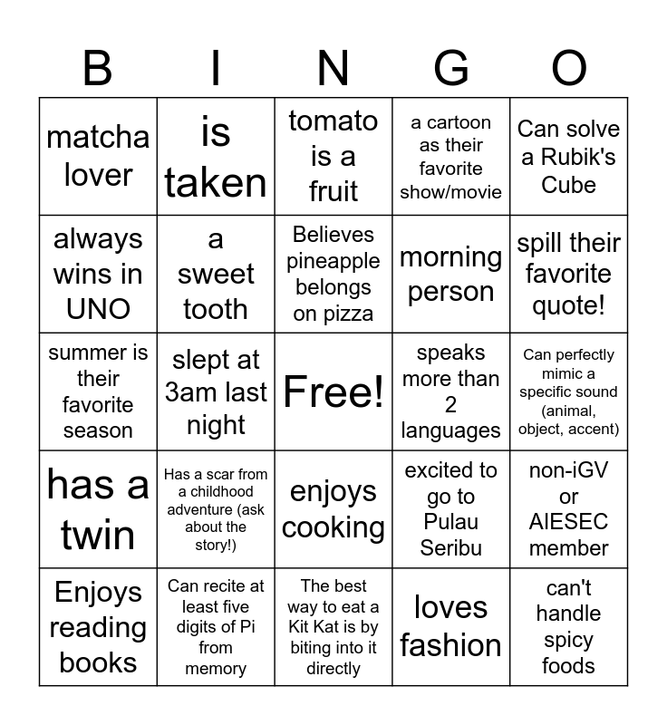This bingo card has a free space and 24 words: Has a scar from a childhood adventure (ask about the story!), Can recite at least five digits of Pi from memory, Believes pineapple belongs on pizza, Enjoys reading books, Can solve a Rubik's Cube, matcha lover, always wins in UNO, is taken, speaks more than 2 languages, enjoys cooking, morning person, summer is their favorite season, excited to go to Pulau Seribu, non-iGV or AIESEC member, a sweet tooth, loves fashion, Can perfectly mimic a specific sound (animal, object, accent), tomato is a fruit, spill their favorite quote!, slept at 3am last night, can't handle spicy foods, has a twin, a cartoon as their favorite show/movie and The best way to eat a Kit Kat is by biting into it directly.