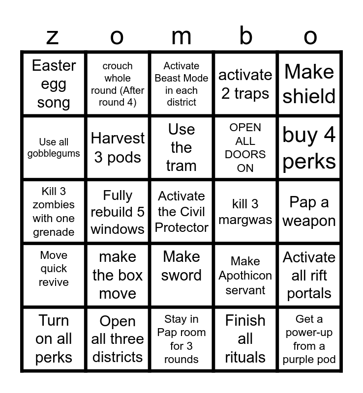 This bingo card has a free space and 24 words: Turn on all perks, make the box move, Use the tram, Finish all rituals, Make shield, Easter egg song, crouch whole round (After round 4), Activate Beast Mode in each district, kill 3 margwas, Pap a weapon, Kill 3 zombies with one grenade, Harvest 3 pods, Make Apothicon servant, Activate all rift portals, Use all gobblegums, Open all three districts, Stay in Pap room for 3 rounds, activate 2 traps, buy 4 perks, Move quick revive, Fully rebuild 5 windows, Make sword, OPEN ALL DOORS ON and Get a power-up from a purple pod.