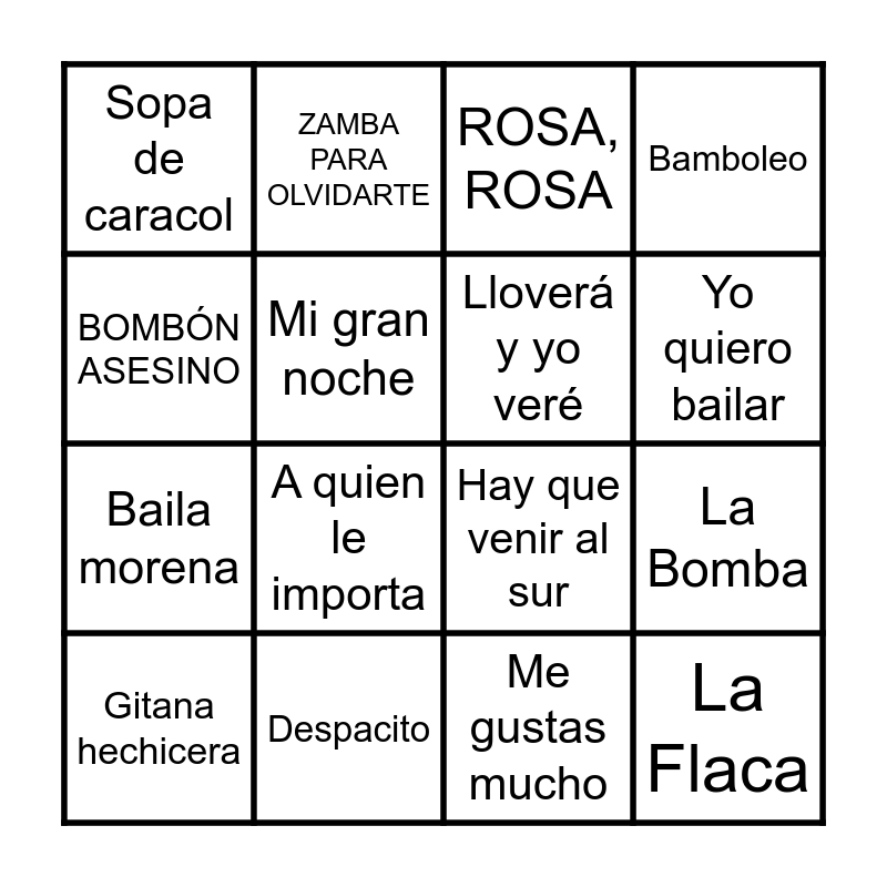 This bingo card has 77 words: LUNA TUCUMANA, GARGANTA CON ARENA, ROSA, ROSA, A DON ATA, MI BUENOS AIRES QUERIDO, A MI MANERA, TE QUIERO TANTO, PEGA LA VUELTA, ZAMBA DE MI ESPERANZA, AMOR SALVAJE, QUE NADIE SEPA MI SUFRIR, LA POLLERA AMARILLA, BOMBÓN ASESINO, ZAMBA PARA OLVIDARTE, ETERNO AMOR, VIVIR ASÍ ES MORIR DE AMOR, 20 de Abril, A quien le importa, Aquí no hay playa, La Bomba, Solo se vive una vez, Mi gran noche, Lloverá y yo veré, Yo quiero bailar, Sopa de caracol, El Venao, Torero, Cuando zarpa el amor, Tractor amarillo, Bienvenidos, Viaje con nosotros, I want to break free, Aserejé, Despacito, Hay que venir al sur, La Flaca, Levantando las manos, Maquillaje, Me gustas mucho, Ni una sola palabra, Que la detengan, Resistiré, Sarandonga, Macarena, Tómbola, Sobreviviré, Salta, Bamboleo, Escándalo, Madre tierra, Entre dos tierras, Caminando por la vida, Chica ye-ye, Como un burro amarrado, El vals del obrero, Despechá, Quevedo: Bzrp, Tacones rojos, Mambo nº5, Todos los dias sale el sol, Gitana hechicera, Single Ladies, La Bamba, Ai seu te pego, La bilirrubina, Twist and Shout, Saturday night, La Primeavera Trompetera, Como Camarón, Ya no quiero ná, Everybody, Wannabe, Baila morena, La Gosadera, Clavado en un bar, Viva la Vida and Rayos de sol.