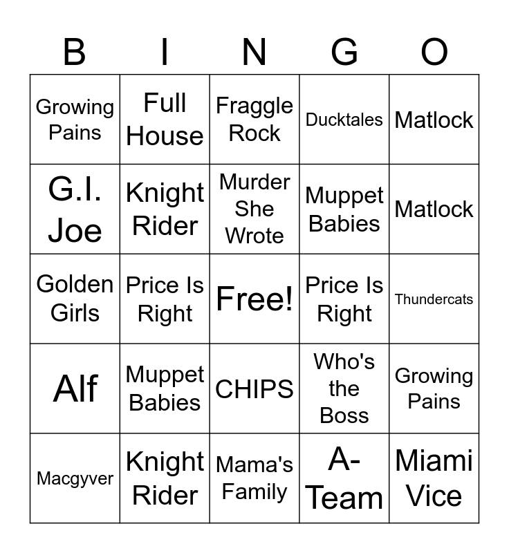 ⚠ This card has duplicate items: 227 (2), Alf (2), A-Team (2), Cheers (2), CHIPS (2), Cosby Show (2), Ducktales (2), Fraggle Rock (2), G.I. Joe (2), Golden Girls (2), Growing Pains (2), Knight Rider (2), Macgyver (2), Magnum, P.I. (2), Mama's Family (2), Miami Vice (2), Muppet Babies (2), Thundercats (2), Who's the Boss (2), Murder She Wrote (2), Price Is Right (2), Matlock (2), Roseanne (2), Full House (2), Teenage Mutant Ninja Turtles (2)