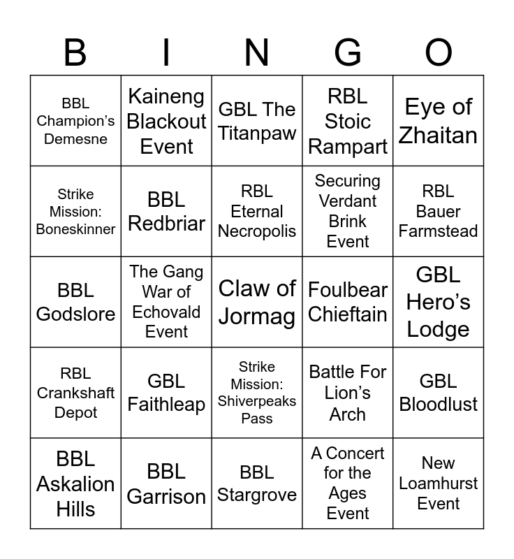 This bingo card has 101 words: Free!, The Great Jungle Wurm, Eye of Zhaitan, Strike Mission: Old Lion’s Court, BBL Woodhaven, RBL O’del Academy, Ceremony of the Sacred Flame Event, GBL Redlake, The Haunting of Doomlore Shrine Event, GBL Redwater Lowlands, RBL Bloodlust, Strike Mission: Whisper of Jormag, Strike Mission: Kaineng Overlook, RBL Osprey’s Palace, Defense of Amnytas Event, Saidra’s Haven Event, RBL Crankshaft Depot, BBL Greenlake, Convergence: Outer Nayos, RBL Hamm’s Lab, Twisted Marionette, Shadow Behemoth, RBL Roy’s Refuge, BBL The Spiritholme, RBL Parched Outpost, RBL Bauer Farmstead, RBL Stoic Rampart, GBL Faithleap, Tequatl the Sunless, Ley-Line Anomaly, Kaineng Blackout Event, GBL The Titanpaw, The Shatterer, BBL Bloodlust, Fire Elemental, Strike Mission: Shiverpeaks Pass, Triple Trouble, Strike Mission: Cold War, A Concert for the Ages Event, BBL Stargrove, BBL Ascension Bay, BBL Askalion Hills, GBL Sunnyhill, GBL Cragtop, Megadestroyer, Claw of Jormag, Karka Queen, Noran’s Homestead Event, BBL Redvale Refuge, New Loamhurst Event, Strike Mission: Cosmic Observatory, Strike Mission: Boneskinner, The Battle for the Jade Sea Event, GBL Garrison, Octovine Event, Crash Site Event, BBL Greenwater Lowlands, Tower of Nightmares, BBL Dawn’s Eyrie, Sandstorm Event, BBL Redbriar, RBL Blistering Undercroft, Convergence: Mount Balrior, Of Mists and Monsters Event, GBL Foghaven, Securing Verdant Brink Event, Strike Mission: Temple of Febe, The Gang War of Echovald Event, BBL Garrison, Strike Mission: Aetherblade Hideout, GBL Shadaran Hills, Strike Mission: Voice of the Fallen and Claw of the Fallen, BBL Champion’s Demesne, GBL Bluevale Refuge, RBL Eternal Necropolis, BBL Godslore, RBL McLain’s Encampment, Strike Mission: Fraenir of Jormag, Taidha Covington, The Ooze Pit Trials Event, SMC on EBG, RBL Dustwhisper Well, Foulbear Chieftain, Jade Maw Event, Modniir Ulgoth, Aetherblade Assault Event, GBL Hero’s Lodge, Dragonstorm Event, Strike Mission: Xunlai Jade Junkyard, A Titanic Voyage Event, Battle For Lion’s Arch, Inquest Golem Mark II, GBL Dreadfall Bay, Dredge Commisar, RBL Boettiger’s Hideaway, GBL Bloodlust, Svanir Shaman, GBL Bluebriar, Strike Mission: Harvest Temple, Night and the Enemy Event and Unlocking the Wizard’s Tower Event.