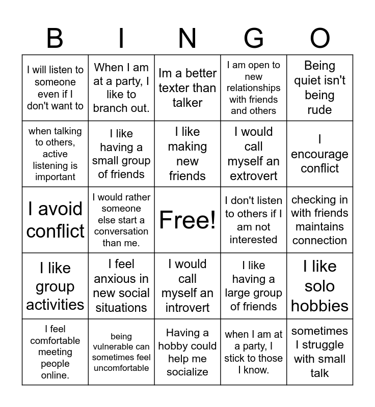 This bingo card has a free space and 24 words: I feel anxious in new social situations, being vulnerable can sometimes feel uncomfortable, I like making new friends, I feel comfortable meeting people online., Being quiet isn't being rude, I will listen to someone even if I don't want to, when talking to others, active listening is important, When I am at a party, I like to branch out., I don't listen to others if I am not interested, I would call myself an introvert, I would call myself an extrovert, I avoid conflict, I like having a large group of friends, I like solo hobbies, I like having a small group of friends, when I am at a party, I stick to those I know., checking in with friends maintains connection, Im a better texter than talker, I encourage conflict, I would rather someone else start a conversation than me., sometimes I struggle with small talk, I like group activities, I am open to new relationships with friends and others and Having a hobby could help me socialize.