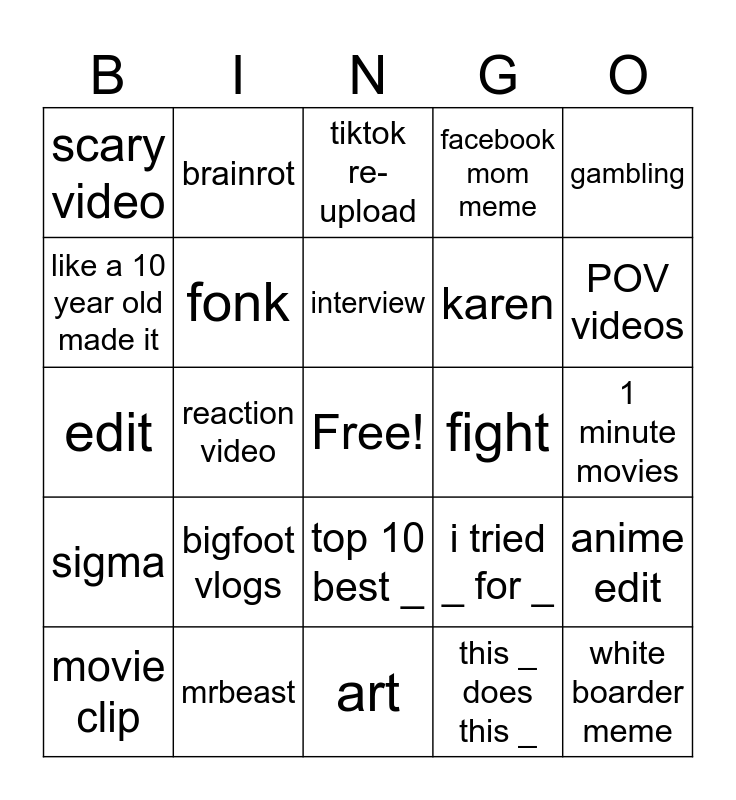 This bingo card has a free space and 24 words: bigfoot vlogs, mrbeast, interview, movie clip, gambling, scary video, like a 10 year old made it, brainrot, fight, top 10 best _, karen, edit, i tried _ for _, anime edit, fonk, this _ does this _, 1 minute movies, tiktok re-upload, POV videos, reaction video, white boarder meme, sigma, facebook mom meme and art.
