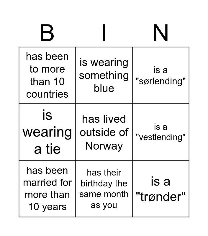 This bingo card has 9 words: has been married for more than 10 years, is a "sørlending", is wearing something blue, is wearing a tie, has been to more than 10 countries, is a "vestlending", has lived outside of Norway, is a "trønder" and has their birthday the same month as you.