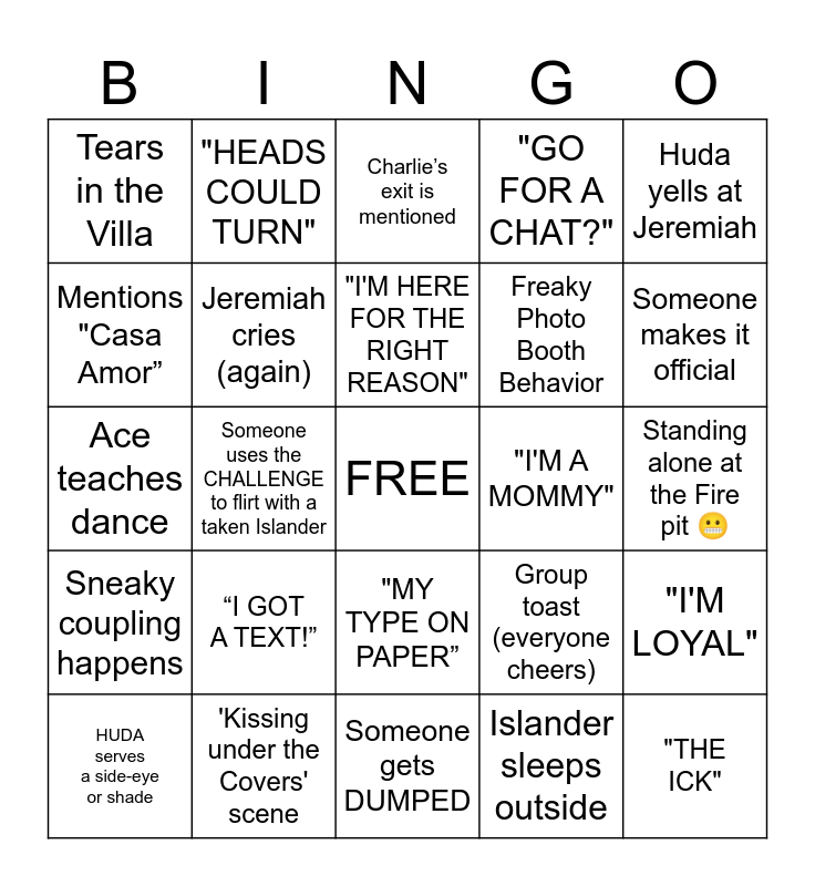 This bingo card has a free space and 29 words: HUDA serves a side-eye or shade, "I’M NOT CLOSED OFF”, Someone uses the CHALLENGE to flirt with a taken Islander, NEW Bombshell drops, Tears in the Villa, Charlie’s exit is mentioned, Jeremiah cries (again), “I GOT A TEXT!”, "I'M A MOMMY", 'Kissing under the Covers' scene, Standing alone at the Fire pit 😬, "THE ICK", Someone gets DUMPED, Islander sleeps outside, Someone makes it official, Cierra dodges a kiss, "MY TYPE ON PAPER”, Sneaky coupling happens, Huda yells at Jeremiah, Ace teaches dance, Group toast (everyone cheers), "IT SHOULD HAVE BEEN ME", Freaky Photo Booth Behavior, Mentions "Casa Amor”, "GO FOR A CHAT?", "HEADS COULD TURN", "I'M LOYAL", "I'M HERE FOR THE RIGHT REASON" and "EARLY DAYS".