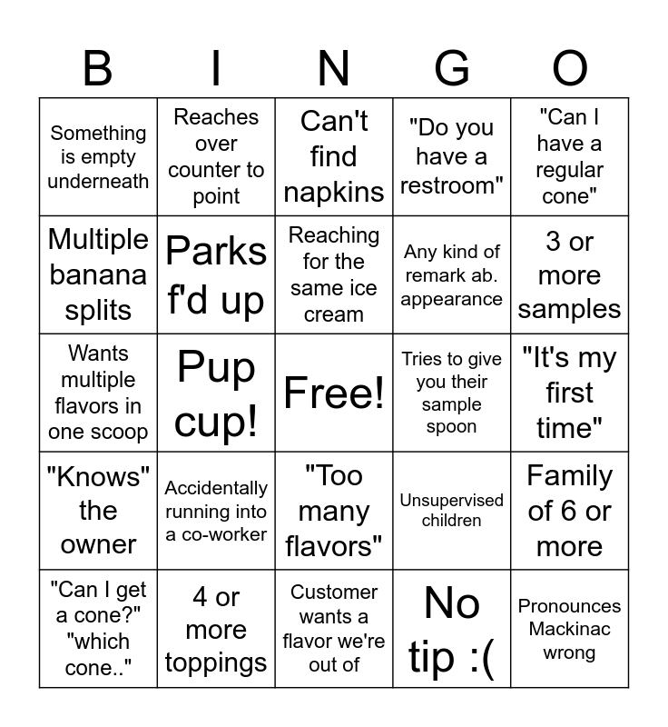 This bingo card has a free space and 24 words: "Can I get a cone?" "which cone..", Accidentally running into a co-worker, Reaching for the same ice cream, No tip :(, "Can I have a regular cone", Something is empty underneath, Reaches over counter to point, Can't find napkins, Tries to give you their sample spoon, "It's my first time", Wants multiple flavors in one scoop, Parks f'd up, Unsupervised children, Family of 6 or more, Multiple banana splits, 4 or more toppings, Customer wants a flavor we're out of, "Do you have a restroom", 3 or more samples, "Knows" the owner, Pup cup!, "Too many flavors", Any kind of remark ab. appearance and Pronounces Mackinac wrong.