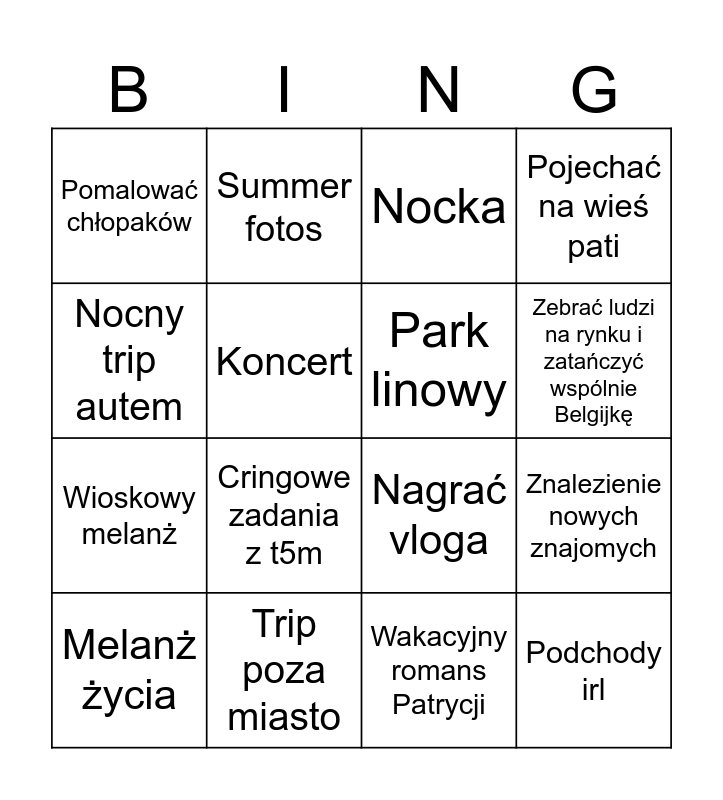 This bingo card has 16 words: Trip poza miasto, Znalezienie nowych znajomych, Nocka, Pomalować chłopaków, Wioskowy melanż, Summer fotos, Nagrać vloga, Wakacyjny romans Patrycji, Nocny trip autem, Koncert, Melanż życia, Pojechać na wieś pati, Cringowe zadania z t5m, Zebrać ludzi na rynku i zatańczyć wspólnie Belgijkę, Park linowy and Podchody irl.