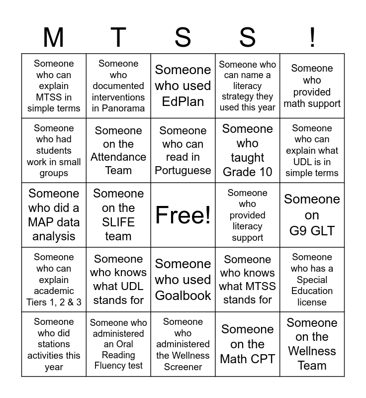 This bingo card has a free space and 24 words: Someone who knows what UDL stands for, Someone who administered an Oral Reading Fluency test, Someone who can read in Portuguese, Someone who did stations activities this year, Someone who provided math support, Someone who can explain MTSS in simple terms, Someone who had students work in small groups, Someone who documented interventions in Panorama, Someone who provided literacy support, Someone who used Goalbook, Someone who taught Grade 10, Someone who did a MAP data analysis, Someone who knows what MTSS stands for, Someone who has a Special Education license, Someone on the Attendance Team, Someone on the Math CPT, Someone on G9 GLT, Someone who used EdPlan, Someone who can explain what UDL is in simple terms, Someone on the SLIFE team, Someone on the Wellness Team, Someone who can explain academic Tiers 1, 2 & 3, Someone who can name a literacy strategy they used this year and Someone who administered the Wellness Screener.