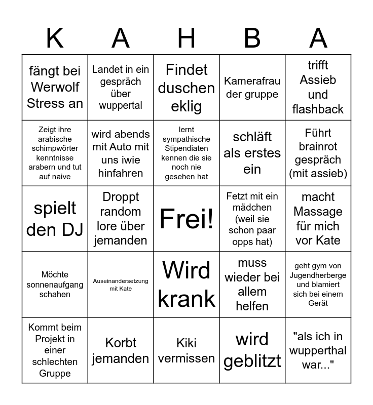 This bingo card has a free space and 24 words: Auseinandersetzung mit Kate, Korbt jemanden, lernt sympathische Stipendiaten kennen die sie noch nie gesehen hat, Kommt beim Projekt in einer schlechten Gruppe, trifft Assieb und flashback, fängt bei Werwolf Stress an, Zeigt ihre arabische schimpwörter kenntnisse arabern und tut auf naive, Landet in ein gespräch über wuppertal, Fetzt mit ein mädchen (weil sie schon paar opps hat), Wird krank, schläft als erstes ein, spielt den DJ, muss wieder bei allem helfen, geht gym von Jugendherberge und blamiert sich bei einem Gerät, wird abends mit Auto mit uns iwie hinfahren, wird geblitzt, macht Massage für mich vor Kate, Findet duschen eklig, Führt brainrot gespräch (mit assieb), Droppt random lore über jemanden, "als ich in wupperthal war...", Möchte sonnenaufgang schahen, Kamerafrau der gruppe and Kiki vermissen.