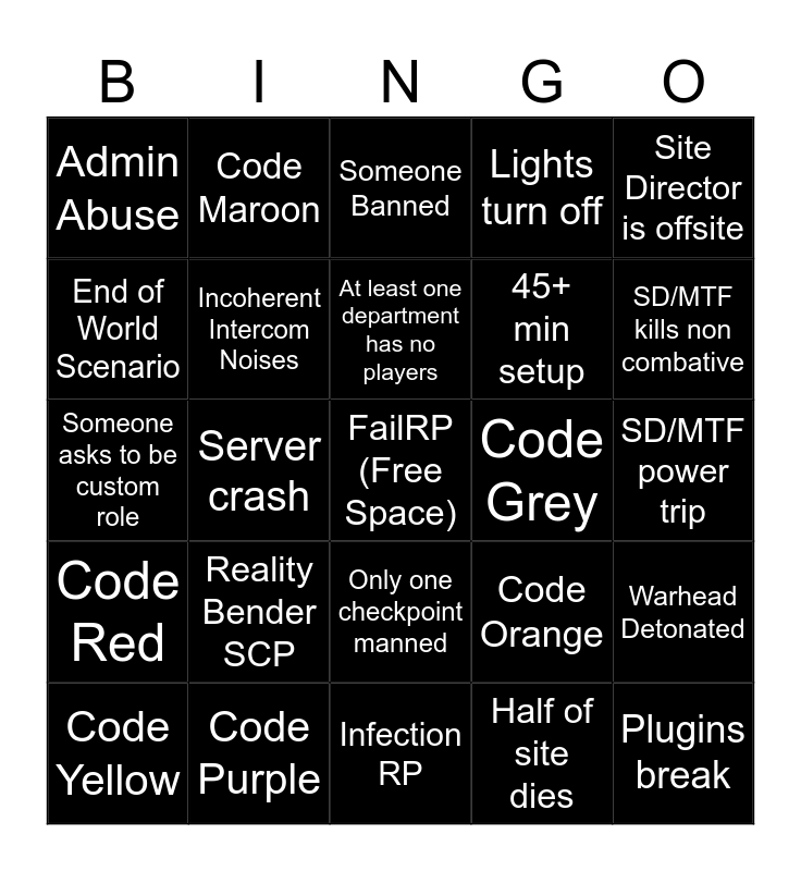 This bingo card has a free space and 27 words: Code Orange, Code White, 45+ min setup, Infection RP, End of World Scenario, Someone Banned, Code Maroon, Code Red, Code Grey, Warhead Detonated, Someone asks to be custom role, Lights turn off, Code Yellow, Code Purple, SD/MTF kills non combative, Mass TK, Incoherent Intercom Noises, At least one department has no players, Reality Bender SCP, Admin Abuse, SD/MTF power trip, Half of site dies, Server crash, Plugins break, Only one checkpoint manned, Site Director is offsite and Custom roles only played by admins.