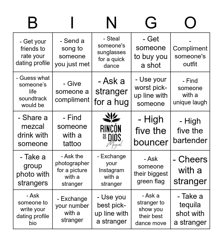 This bingo card has a free space and 41 words: - Post a story and tag @mache.tx, - Share a mezcal drink with someone, - Share a shot with someone you think is cute, - Give someone a compliment, - Exchange your number with a stranger, - Exchange your Instagram with a stranger, - Ask a stranger for a hug, - Dance with someone you don't know, - Compliment someone's outfit, - Take a group photo with strangers, - Find someone with a tattoo, - Get someone to buy you a shot, - Take a tequila shot with a stranger, - High five the bartender, - High five the bouncer, - Ask the photographer for a picture with a stranger, - Text a compliment to someone you just met, - Get your friends to rate your dating profile, - Swap your bingo card with someone, - Steal someone's sunglasses for a quick dance, - Cheers with a stranger, - Let someone else order a drink for you, - Use you best pick-up line with a stranger, - Use your worst pick-up line with someone, - Ask a stranger for dating advice, - Get a random guy to serenade you with a love song, - Ask a stranger to show you their best dance move, - Share a taco moment with someone, - Find someone with a unique laugh, - Set up a coffee date with someone new, - Tell someone what you're most proud of right now, - Send a song to someone you just met, - Ask someone to write your dating profile bio, - Ask someone what their toxic trait is, - Ask someone their biggest green flag, - Guess what someone’s life soundtrack would be, - Find someone who doesn’t do social media, - Ask someone what their tattoo means, - Ask your friend what you haven’t asked before, - Find someone from out of town and - Ask a stranger if coffee or tea?.