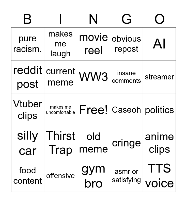 This bingo card has a free space and 24 words: Thirst Trap, offensive, WW3, food content, AI, pure racism., reddit post, makes me laugh, Caseoh, old meme, insane comments, Vtuber clips, cringe, anime clips, current meme, asmr or satisfying, politics, movie reel, streamer, makes me uncomfortable, TTS voice, silly car, obvious repost and gym bro.