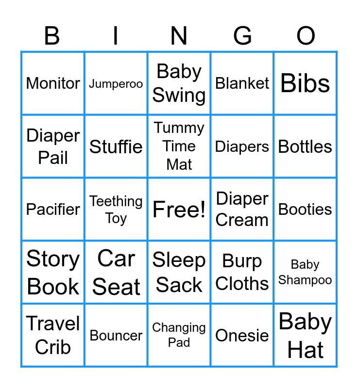 This bingo card has a free space and 24 words: Car Seat, Bouncer, Tummy Time Mat, Travel Crib, Bibs, Monitor, Diaper Pail, Jumperoo, Diaper Cream, Sleep Sack, Diapers, Pacifier, Burp Cloths, Baby Shampoo, Stuffie, Onesie, Booties, Baby Swing, Bottles, Teething Toy, Baby Hat, Story Book, Blanket and Changing Pad.
