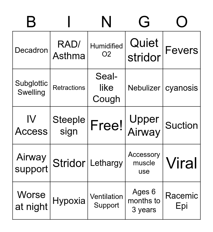 This bingo card has a free space and 24 words: Stridor, Hypoxia, Seal-like Cough, Worse at night, Fevers, Decadron, Subglottic Swelling, RAD/ Asthma, Upper Airway, Lethargy, Nebulizer, IV Access, Accessory muscle use, Viral, Retractions, Ages 6 months to 3 years, Suction, Humidified O2, cyanosis, Steeple sign, Racemic Epi, Airway support, Quiet stridor and Ventilation Support.