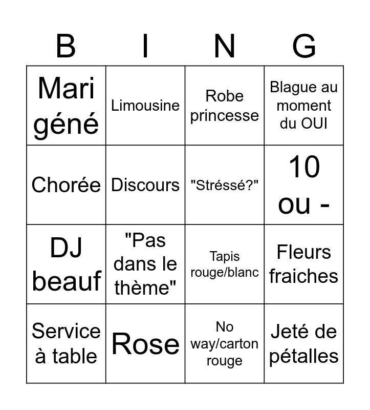 This bingo card has 16 words: Rose, Fleurs fraiches, Robe princesse, Mari géné, DJ beauf, Limousine, Tapis rouge/blanc, No way/carton rouge, Chorée, Discours, Service à table, Blague au moment du OUI, "Pas dans le thème", 10 ou -, "Stréssé?" and Jeté de pétalles.