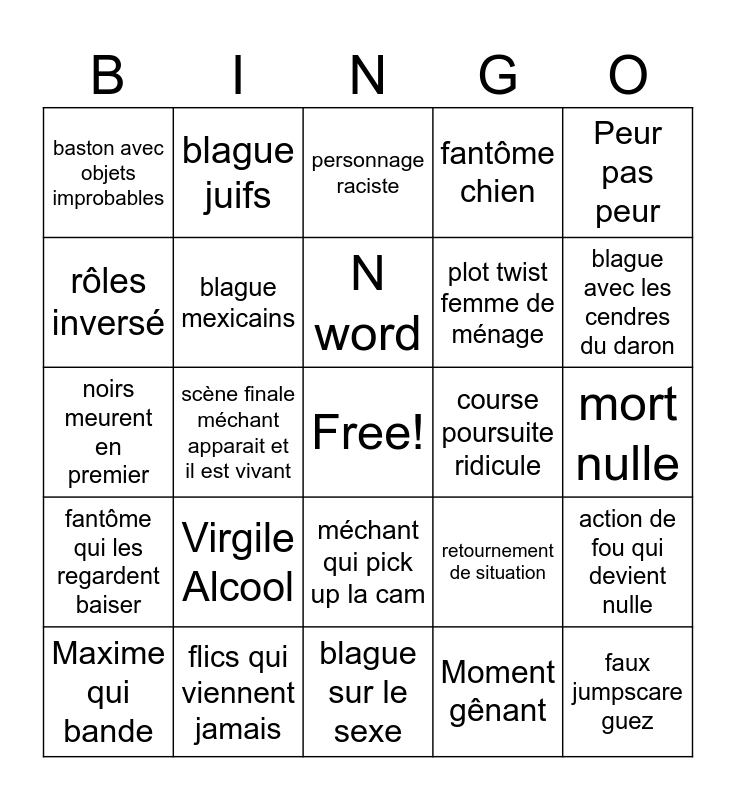 This bingo card has a free space and 24 words: Maxime qui bande, Virgile Alcool, N word, Moment gênant, Peur pas peur, baston avec objets improbables, blague juifs, personnage raciste, course poursuite ridicule, mort nulle, noirs meurent en premier, blague mexicains, retournement de situation, action de fou qui devient nulle, rôles inversé, flics qui viennent jamais, blague sur le sexe, fantôme chien, blague avec les cendres du daron, fantôme qui les regardent baiser, scène finale méchant apparait et il est vivant, méchant qui pick up la cam, plot twist femme de ménage and faux jumpscare guez.