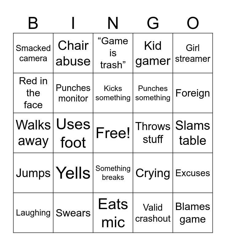 This bingo card has a free space and 24 words: Yells, Swears, Kicks something, Laughing, Girl streamer, Smacked camera, Red in the face, Chair abuse, Throws stuff, Something breaks, Punches something, Walks away, Crying, Excuses, Punches monitor, Valid crashout, Slams table, “Game is trash”, Foreign, Uses foot, Blames game, Jumps, Kid gamer and Eats mic.