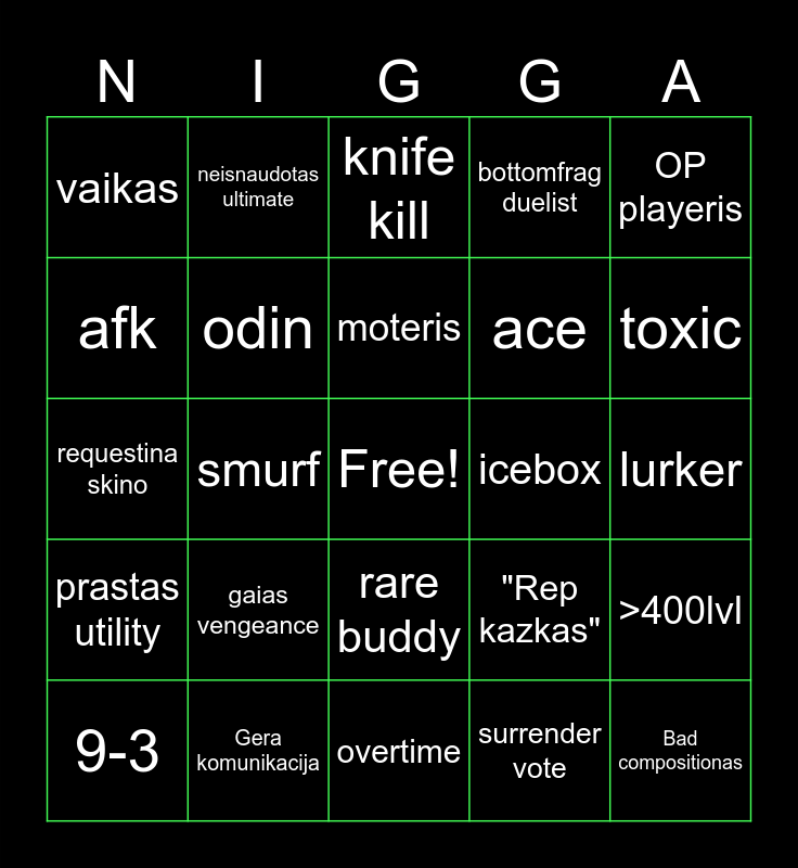 This bingo card has a free space and 24 words: gaias vengeance, Gera komunikacija, moteris, 9-3, OP playeris, vaikas, afk, neisnaudotas ultimate, icebox, rare buddy, ace, requestina skino, "Rep kazkas", >400lvl, odin, surrender vote, lurker, knife kill, toxic, smurf, Bad compositionas, prastas utility, bottomfrag duelist and overtime.
