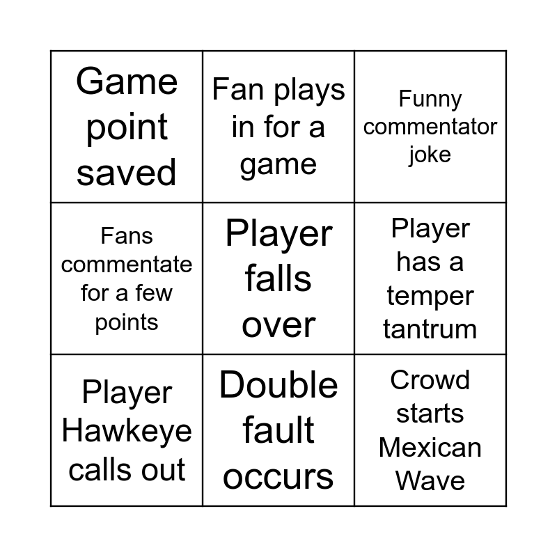 This bingo card has 42 words: Fan shouts a funny heckle, Double fault occurs, Rally lasts 15 shots, Player misses a drop shot, Player hits a smash, Ball goes over fence, Player wears a silly accessory, Someone interrupts the point, Funny commentator joke, Really bad mistake (shout “what was that”), Hits an ace, Player swaps hand whilst playing, Excessively loud grunt, Player falls over, Fan gets commentator a drink, Players swap rackets for a point, Hawkeye shows ball in, Player misses a tweener, Commentator forgets the score, Fan plays in for a game, Player has a temper tantrum, Commentator makes a bad pun, Player hits a trick shot, Game point saved, Player misses a no-look shot, Crowd starts a chant, Crowd starts Mexican Wave, Player hits a one-handed backhand, Player dives for a shot, Player foot faults on a serve, Very Long Rally, Player runs round the net onto other side, Player Hawkeye calls out, Player blames partner, Standing ovation from the crowd, Commentator mixes up player names, Commentator insults player, Down the line winner, Commentator spills something, Fan holds up a funny sign, Fans commentate for a few points and Players have dance battle with crowd.