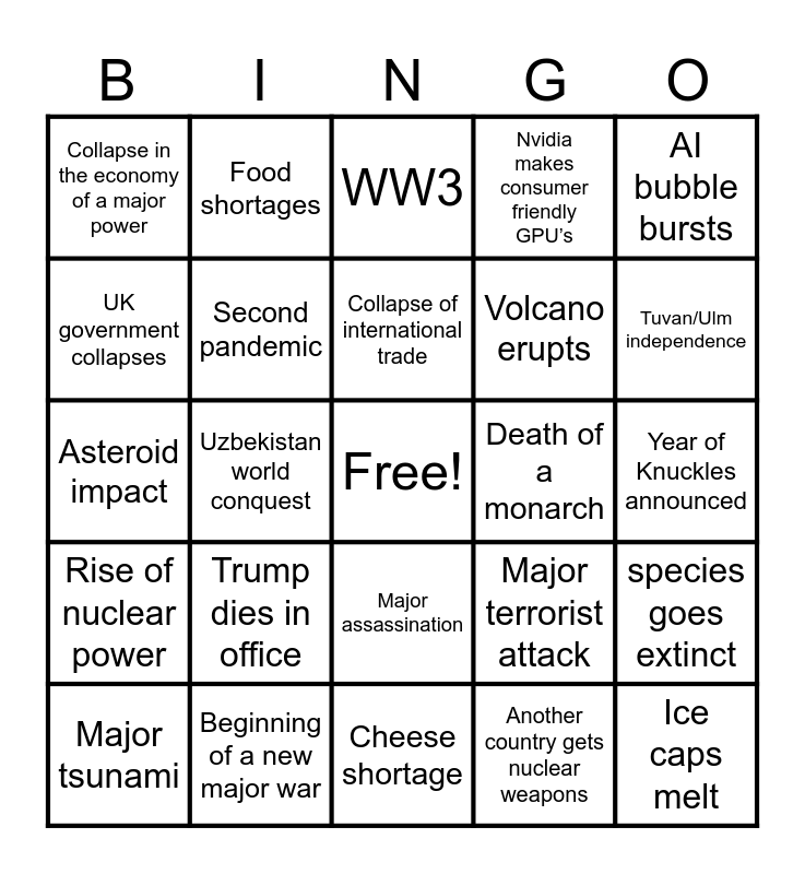 This bingo card has a free space and 24 words: Trump dies in office, Beginning of a new major war, Collapse of international trade, Major tsunami, AI bubble bursts, Collapse in the economy of a major power, UK government collapses, Food shortages, Death of a monarch, Major assassination, Volcano erupts, Asteroid impact, Major terrorist attack, species goes extinct, Second pandemic, Another country gets nuclear weapons, Year of Knuckles announced, WW3, Tuvan/Ulm independence, Uzbekistan world conquest, Ice caps melt, Rise of nuclear power, Nvidia makes consumer friendly GPU’s and Cheese shortage.