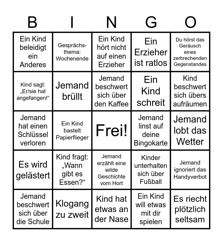 This bingo card has a free space and 24 words: Jemand beschwert sich über die Schule, Kind fragt: „Wann gibt es Essen?“, Jemand beschwert sich über den Kaffee, Ein Kind will etwas mit dir spielen, Du hörst das Geräusch eines zerbrechenden Gegenstandes, Ein Kind beleidigt ein Anderes, Gesprächs- thema: Wochenende, Ein Kind hört nicht auf einen Erzieher, Jemand linst auf deine Bingokarte, Jemand lobt das Wetter, Jemand hat einen Schlüssel verloren, Jemand brüllt, Kinder unterhalten sich über Fußball, Jemand ignoriert das Handyverbot, Kind sagt: „Er/sie hat angefangen!“, Klogang zu zweit, Kind hat etwas an der Nase, Ein Erzieher ist ratlos, Kind beschwert sich übers aufräumen, Es wird gelästert, Ein Kind bastelt Papierflieger, Jemand erzählt eine wilde Geschichte vom Hort, Ein Kind schreit and Es riecht plötzlich seltsam.
