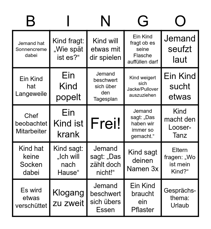 This bingo card has a free space and 24 words: Kind sagt: „Ich will nach Hause“, Klogang zu zweit, Jemand beschwert sich über den Tagesplan, Es wird etwas verschüttet, Jemand seufzt laut, Jemand hat Sonnencreme dabei, Ein Kind hat Langeweile, Kind fragt: „Wie spät ist es?“, Jemand sagt: „Das haben wir immer so gemacht.“, Jemand sagt: „Das zählt doch nicht!“, Kind weigert sich Jacke/Pullover auszuziehen, Chef beobachtet Mitarbeiter, Kind sagt deinen Namen 3x, Eltern fragen: „Wo ist mein Kind?“, Ein Kind popelt, Ein Kind braucht ein Pflaster, Kind macht den Looser-Tanz, Kind will etwas mit dir spielen, Ein Kind sucht etwas, Ein Kind ist krank, Gesprächs-thema: Urlaub, Kind hat keine Socken dabei, Ein Kind fragt ob es seine Flasche auffüllen darf and Jemand beschwert sich übers Essen.