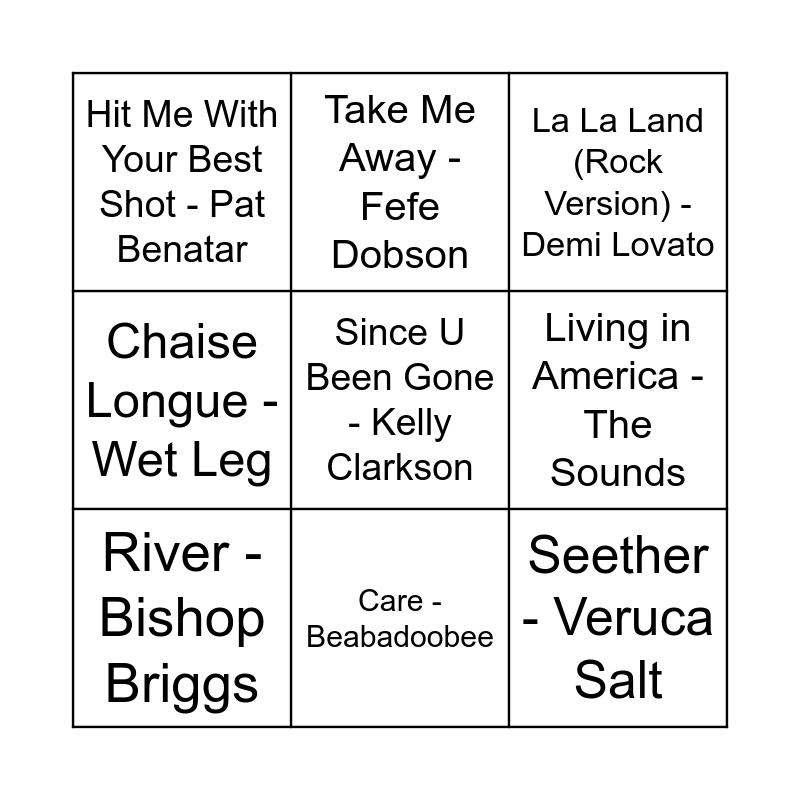This bingo card has 20 words: Stranded - Plumb, Bad Reputation - Joan Jett, La La Land (Rock Version) - Demi Lovato, Sk8er Boi - Avril Lavigne, Only Happy When It Rains - Garbage, Since U Been Gone - Kelly Clarkson, Midnight Sky - Miley Cyrus, Hit Me With Your Best Shot - Pat Benatar, Seether - Veruca Salt, Take Me Away - Fefe Dobson, Hedonism (Just Because You Feel Good) - Skunk Anansie, Dreams - The Cranberries, Living in America - The Sounds, What the Water Gave Me - Florence + The Machine, River - Bishop Briggs, Hardly Wait - Juliette Lewis, Care - Beabadoobee, Chaise Longue - Wet Leg, Crybaby - Destroy Boys and Closer - Tegan and Sara.
