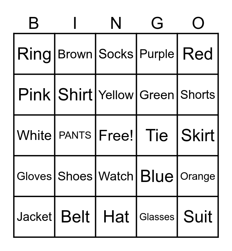This bingo card has a free space and 29 words: Jacket, Dress, PANTS, NECKLESS, Ring, Socks, Shirt, Shoes, Tie, Belt, Skirt, Suit, Hat, Glasses, Shorts, Sweater, Watch, Gloves, Red, White, Blue, Black, Green, Pink, Purple, Brown, Orange, Yellow and Grey.
