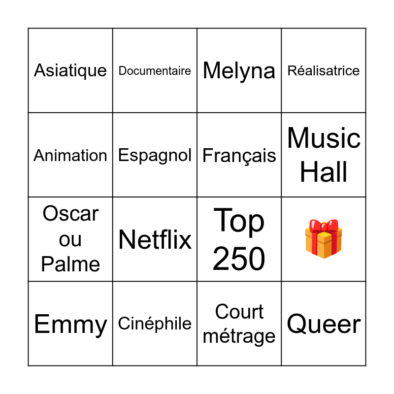 This bingo card has 16 words: Cinéphile, 🎁, Melyna, Asiatique, Oscar ou Palme, Documentaire, Top 250, Court métrage, Animation, Espagnol, Emmy, Réalisatrice, Netflix, Music Hall, Français and Queer.