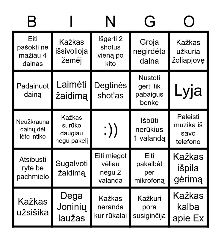 This bingo card has a free space and 33 words: Užsidėti kito žmogaus akinius/kepurę, Nusifotografuoti su kitu žmogumi, Degtinės shot'as, Laimėti tinklinį, Paleisti muziką iš savo telefono, Eiti pašokti ne mažiau 4 dainas, Laimėti žaidimą, Kažkas neranda kur rūkalai, Nustoti gerti tik pabaigus bonkę, Kažkas kalba apie Ex, Padainuot dainą, Kažkas išsivolioja žemėj, Kažkuri pora susiginčija, Groja Džordana Butkutė, Neužkrauna dainų dėl lėto intiko, Kažkas surūko daugiau negu pakelį, Eiti miegot vėliau negu 2 valanda, Eiti pakalbėt per mikrofoną, Kažkas išpila gėrimą, Atsibusti ryte be pachmielo, Dega Joninių laužas, Papilstyti kitam žmogui, bet ne tos pačios bonkės sugėrovui, Groja negirdėta daina, Lyja, Išlaukti saulės patekėjimo, Sugalvoti žaidimą, Išgerti 2 shotus vieną po kito, Išbūti nerūkius 1 valandą, Kažkas užkuria žoliapjovę, Kažkas užsišika, Kažkas pasigeria, Padėti susitvarkyti šiukšles and Pakviesti kažką eiti kartu šokti.
