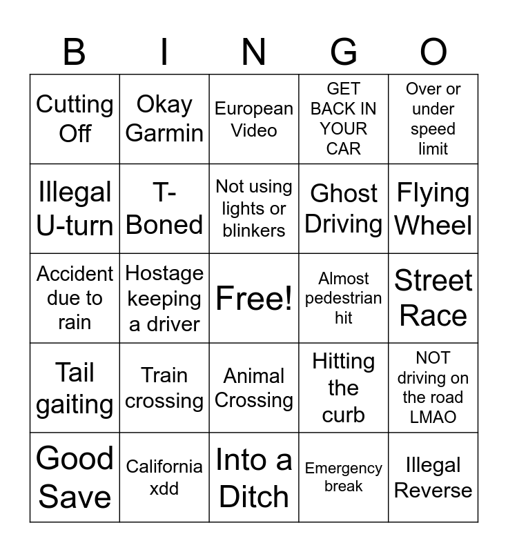 This bingo card has a free space and 59 words: Florida xdd, California xdd, Karen moment, Tail gaiting, Emergency break, You can't park there, T-Boned, Wrong lane, Ghost Driving, Break Checking, GET BACK IN YOUR CAR, Clearly scamming xdd, Illegal U-turn, Losing Parts, Lane weaving, Cutting Off, Illegal Reverse, Over or under speed limit, Truck messing up HARD, Not using lights or blinkers, Almost pedestrian hit, European Video, Good Save, NOT driving on the road LMAO, Wheelie, Flying Car (all wheels off the road), Flipping Car, Tokyo Drift, Flying Wheel, throwing something at dashcam, UNDERCOVER POLICE KEKW, Police trolling, Running through stop sign/ red light, Someone cursing, Okay Garmin, Tesla xdd, hits a building, Hostage keeping a driver, Accident due to snow, Accident due to rain, expensive car fail, Train crossing, Street Race, Sudden stop on highway, Smoke from car, Car on FIRE, Motorcycle slide, America Moment (Gun), Animal Crossing, Into a Ditch, Sparklezzz, Hill/ Mountain Accident, Jeep aah moment, Redlining, Tree Oopsie, Hitting the curb, Offroad Rage, Trailer flips and Car Tire blowout.