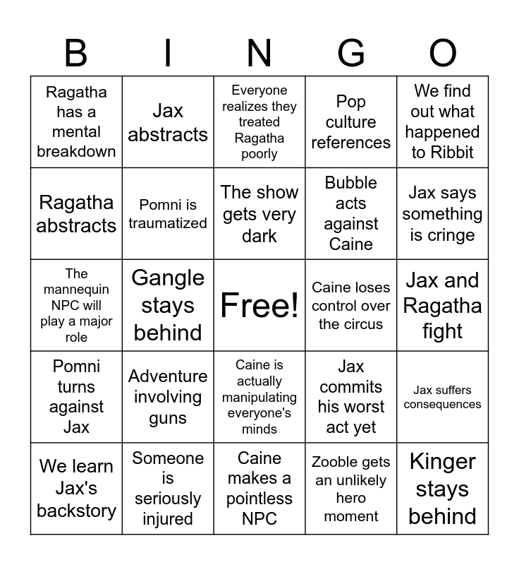 This bingo card has a free space and 24 words: Adventure involving guns, Someone is seriously injured, The show gets very dark, We learn Jax's backstory, We find out what happened to Ribbit, Ragatha has a mental breakdown, Ragatha abstracts, Jax abstracts, Caine loses control over the circus, Caine is actually manipulating everyone's minds, Bubble acts against Caine, The mannequin NPC will play a major role, Jax commits his worst act yet, Jax suffers consequences, Pomni is traumatized, Zooble gets an unlikely hero moment, Jax and Ragatha fight, Everyone realizes they treated Ragatha poorly, Jax says something is cringe, Gangle stays behind, Kinger stays behind, Pomni turns against Jax, Pop culture references and Caine makes a pointless NPC.