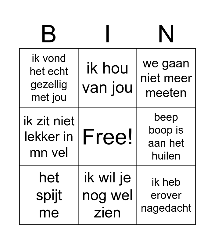 This bingo card has a free space and 8 words: beep boop is aan het huilen, we gaan niet meer meeten, ik hou van jou, het spijt me, ik vond het echt gezellig met jou, ik heb erover nagedacht, ik zit niet lekker in mn vel and ik wil je nog wel zien.
