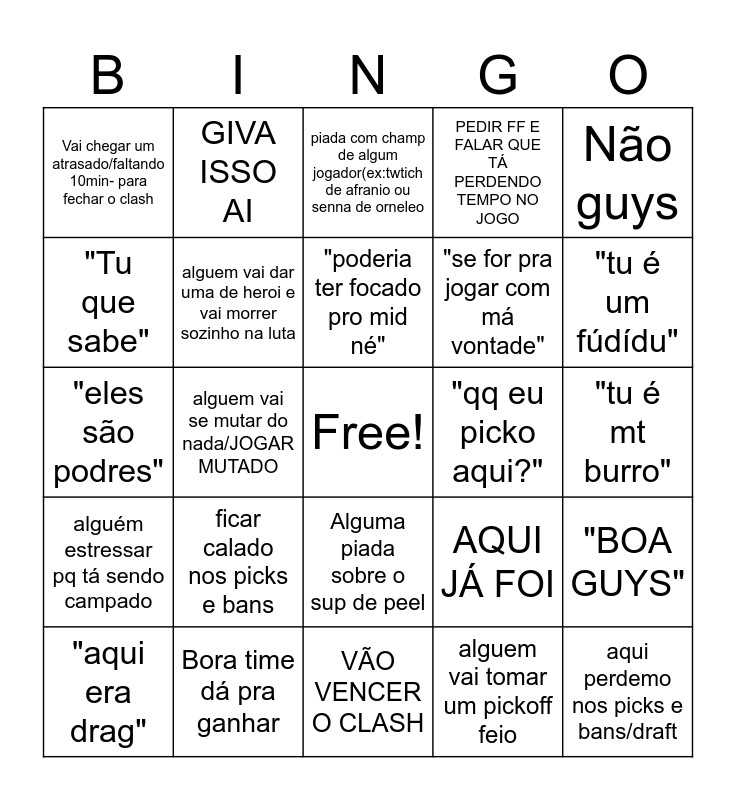 This bingo card has a free space and 24 words: ficar calado nos picks e bans, Bora time dá pra ganhar, "poderia ter focado pro mid né", "aqui era drag", Não guys, Vai chegar um atrasado/faltando 10min- para fechar o clash, "Tu que sabe", GIVA ISSO AI, "qq eu picko aqui?", Alguma piada sobre o sup de peel, "se for pra jogar com má vontade", "eles são podres", AQUI JÁ FOI, "BOA GUYS", alguem vai dar uma de heroi e vai morrer sozinho na luta, alguem vai tomar um pickoff feio, "tu é mt burro", piada com champ de algum jogador(ex:twtich de afranio ou senna de orneleo, "tu é um fúdídu", alguem vai se mutar do nada/JOGAR MUTADO, aqui perdemo nos picks e bans/draft, alguém estressar pq tá sendo campado, PEDIR FF E FALAR QUE TÁ PERDENDO TEMPO NO JOGO and VÃO VENCER O CLASH.